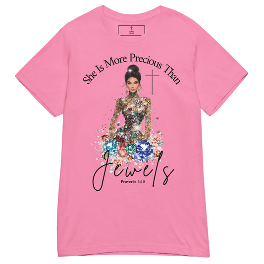 Wear your faith boldly with ourunisex "She Is More Precious Than Jewels" Christian T-Shirt for a looser fit. This cute christian Shirt provides everyday comfort meets & eternal truth. Made for those who walk in faith, step into purpose, and have a desire to shine His light.