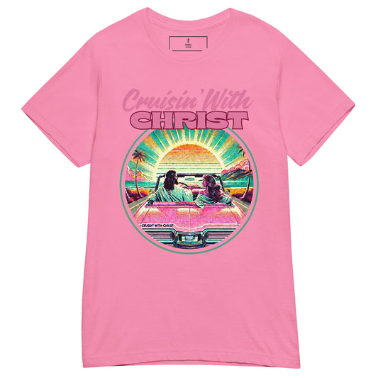 Wear your faith boldly with our unisex "Cruisin' With Christ" Christian T-Shirt for a looser fit. This cute car surfing style Jesus Shirt provides everyday comfort meets & eternal truth. Made for women who walk in faith, step into purpose, and have a desire to shine His light.